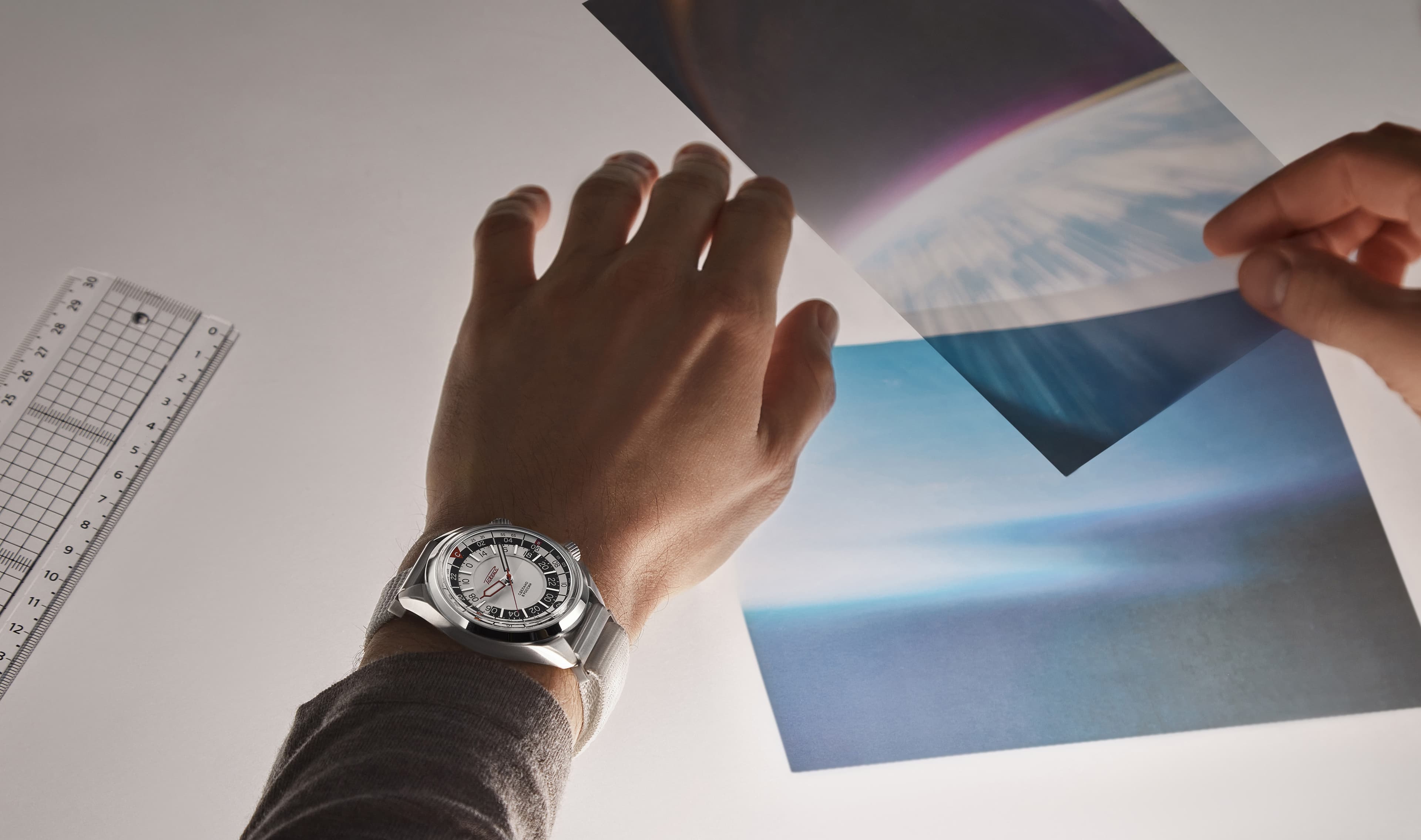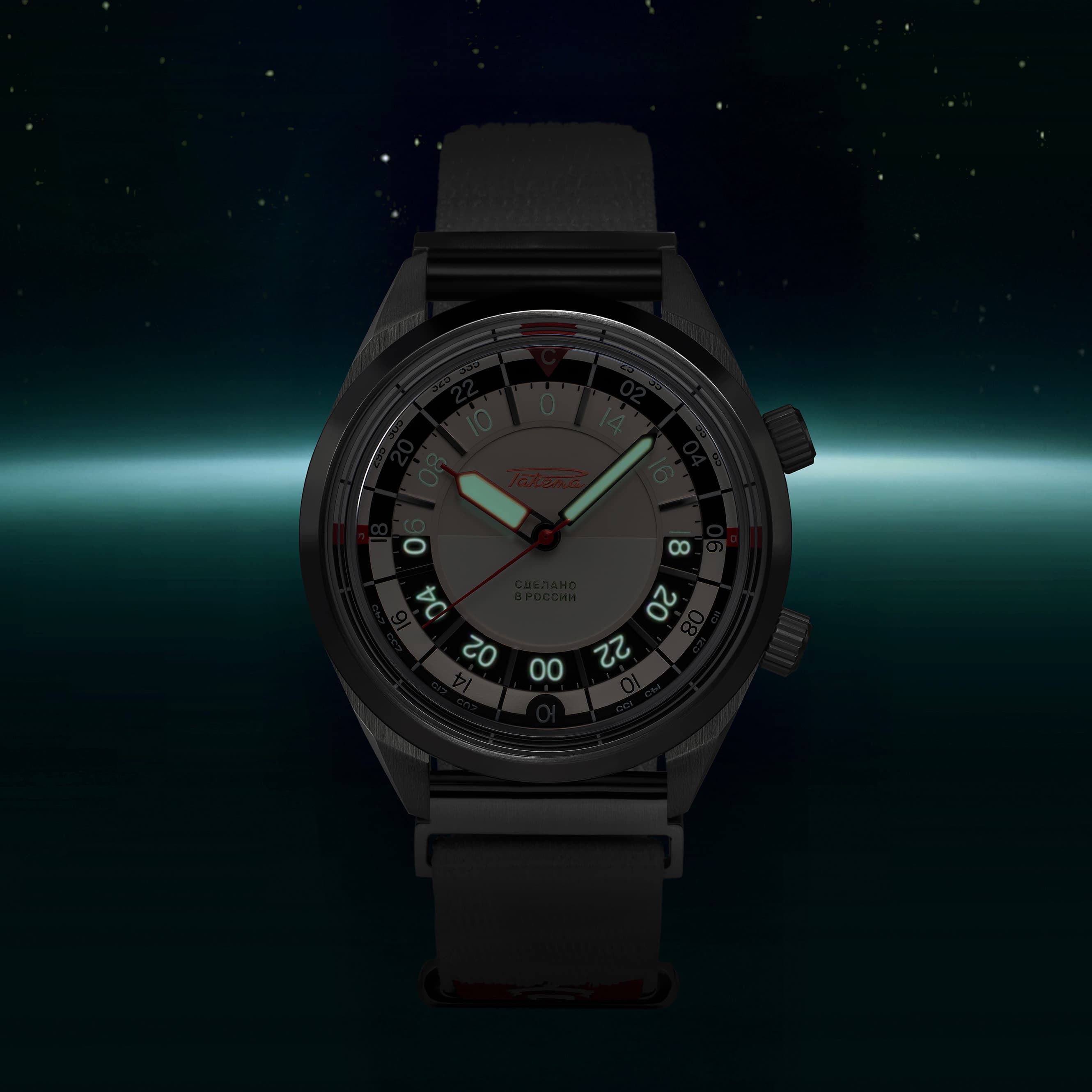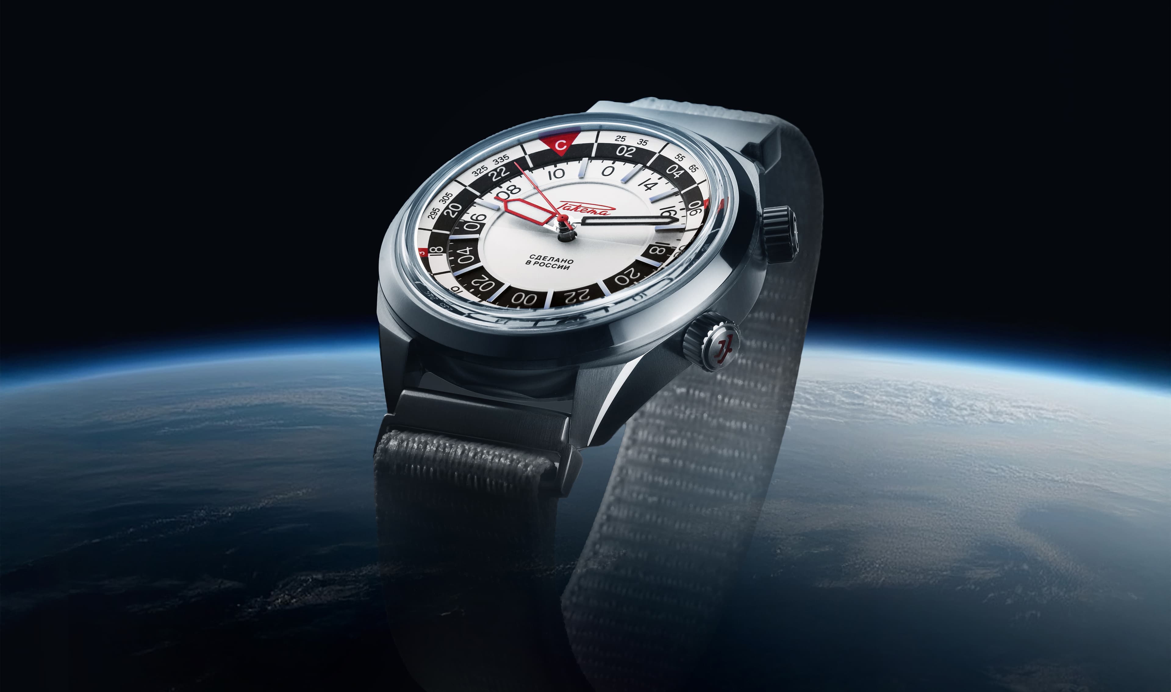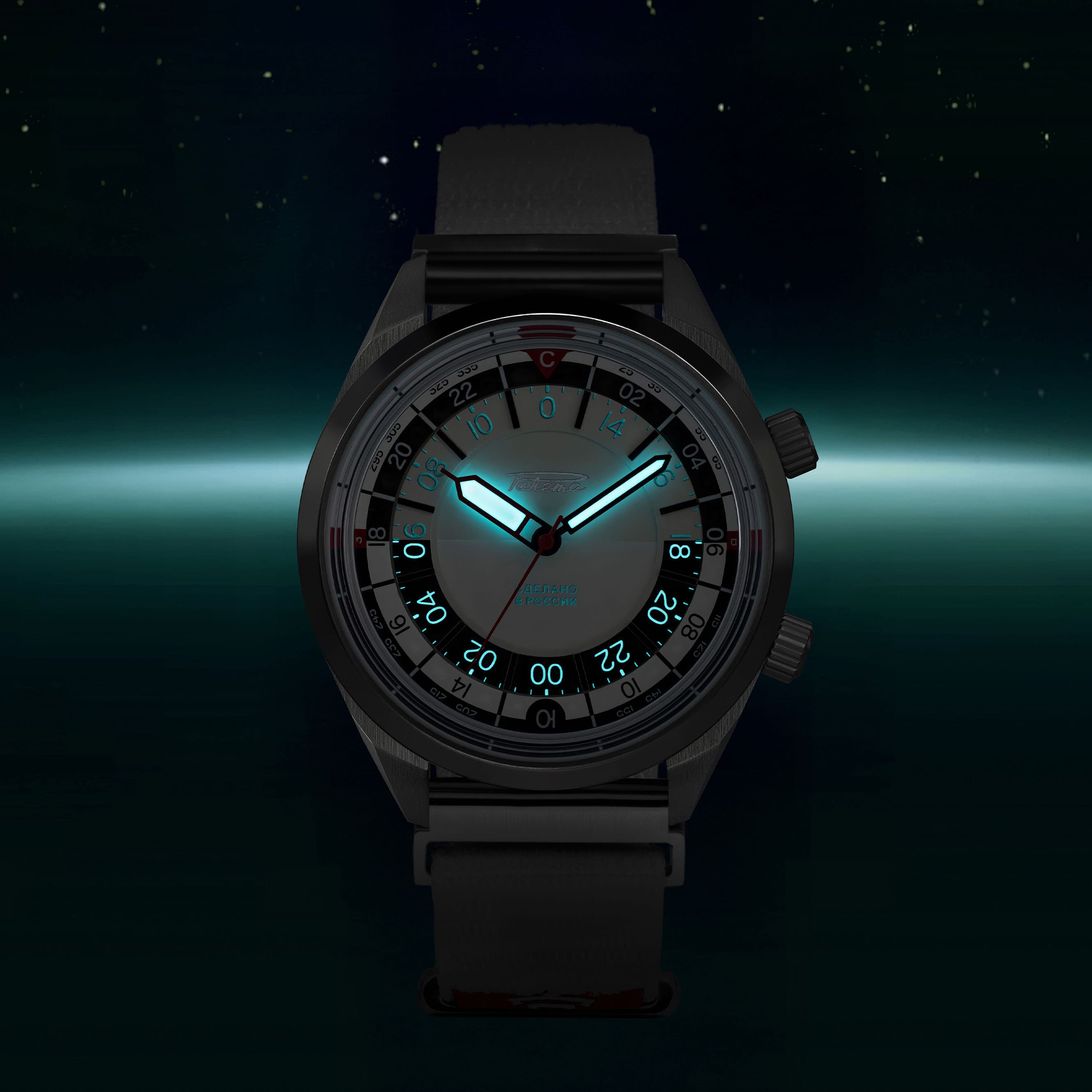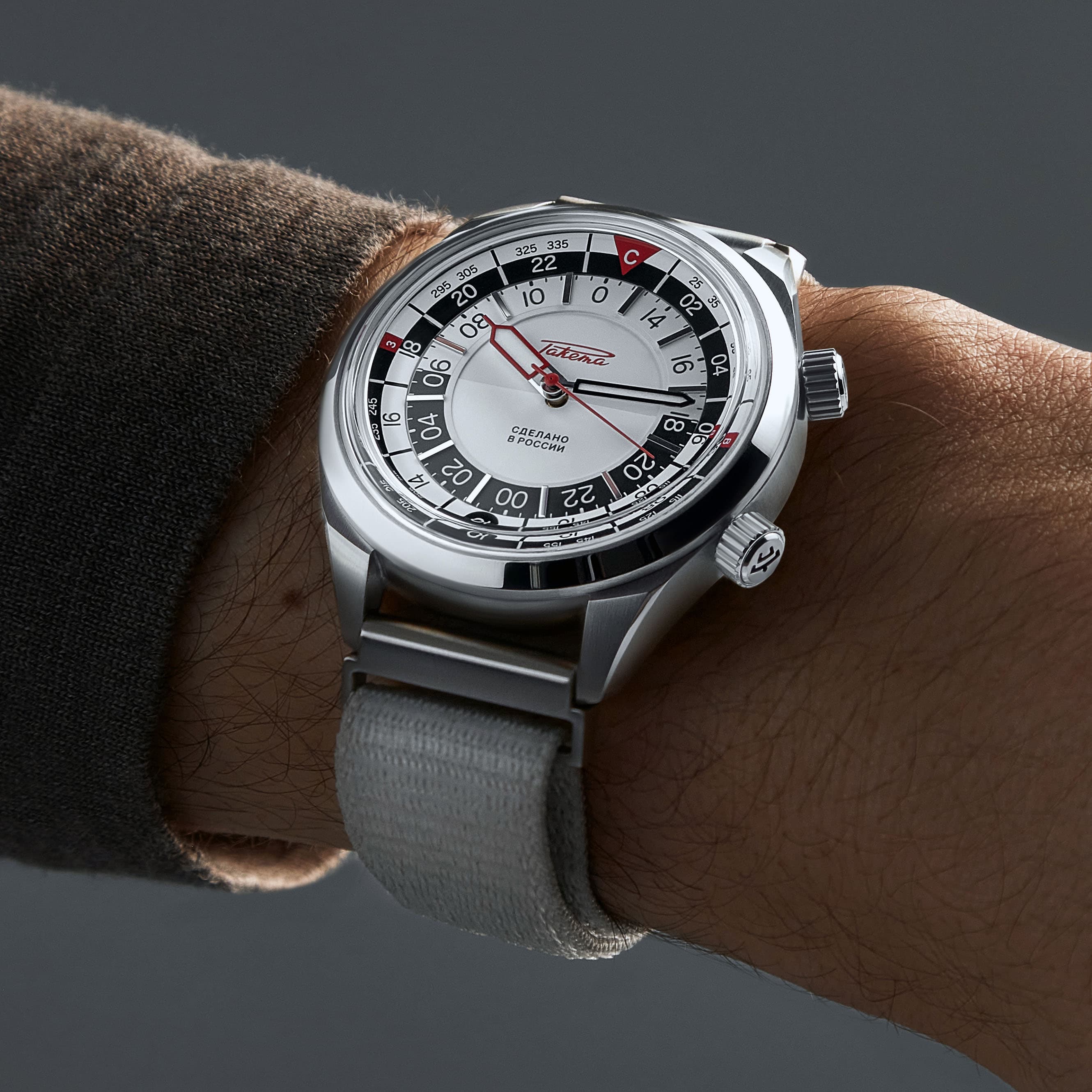 Aboard the ISS, it is more convenient for cosmonauts to track time in 24-hour cycles, so the key design feature of this watch is its 24-hour dial with contrasting black and white sections to easily distinguish day from night. An additional crown sets a second time zone, enabling cosmonauts to keep track of both GMT, used on the ISS, and the local time on Earth. The solar compass, located on a rotating bezel around the dial, completes and complements the watch's functionality. This tool will help cosmonauts to find their bearings and survive in case they have landed in the wrong place, such as for example the taiga, and their electronic compass has failed.