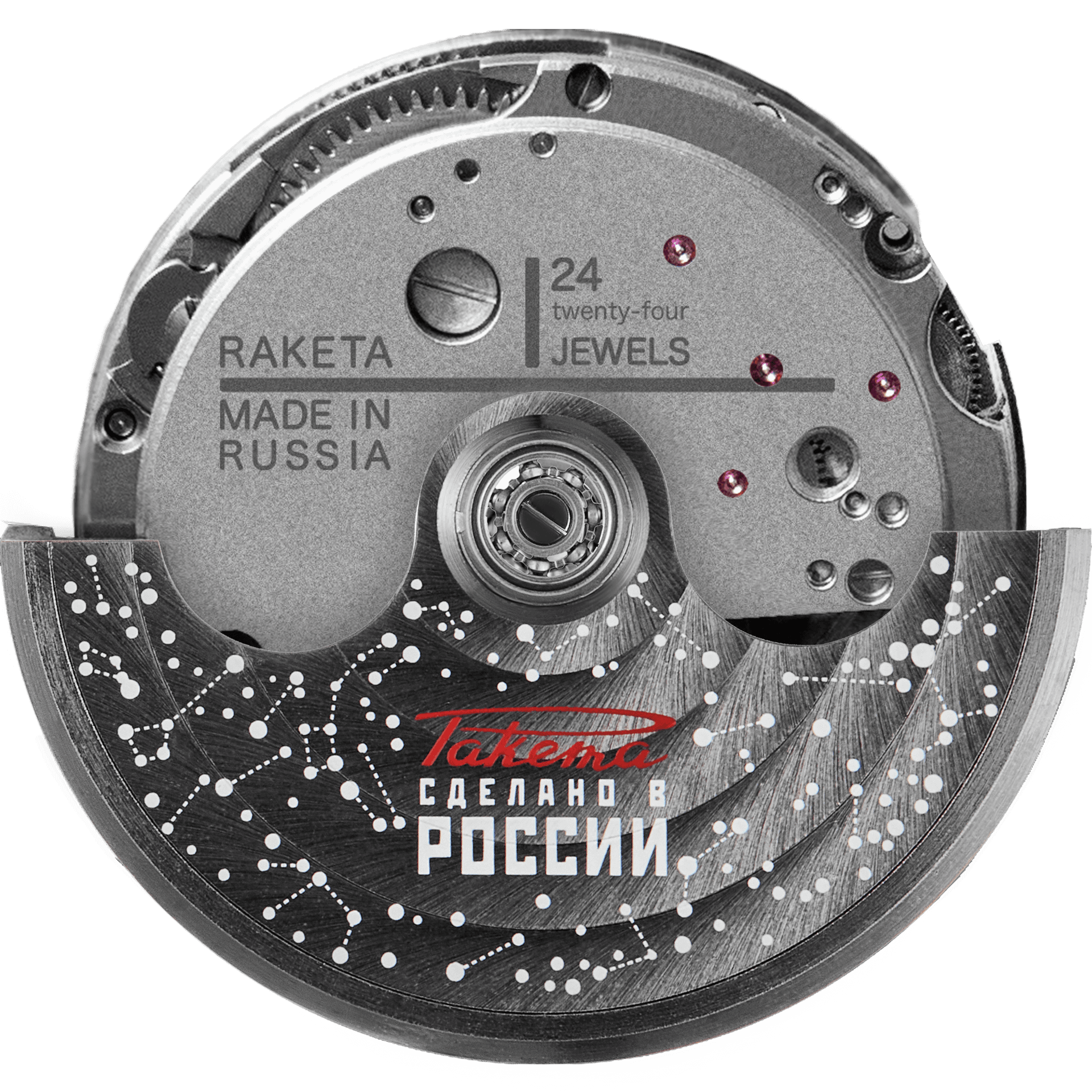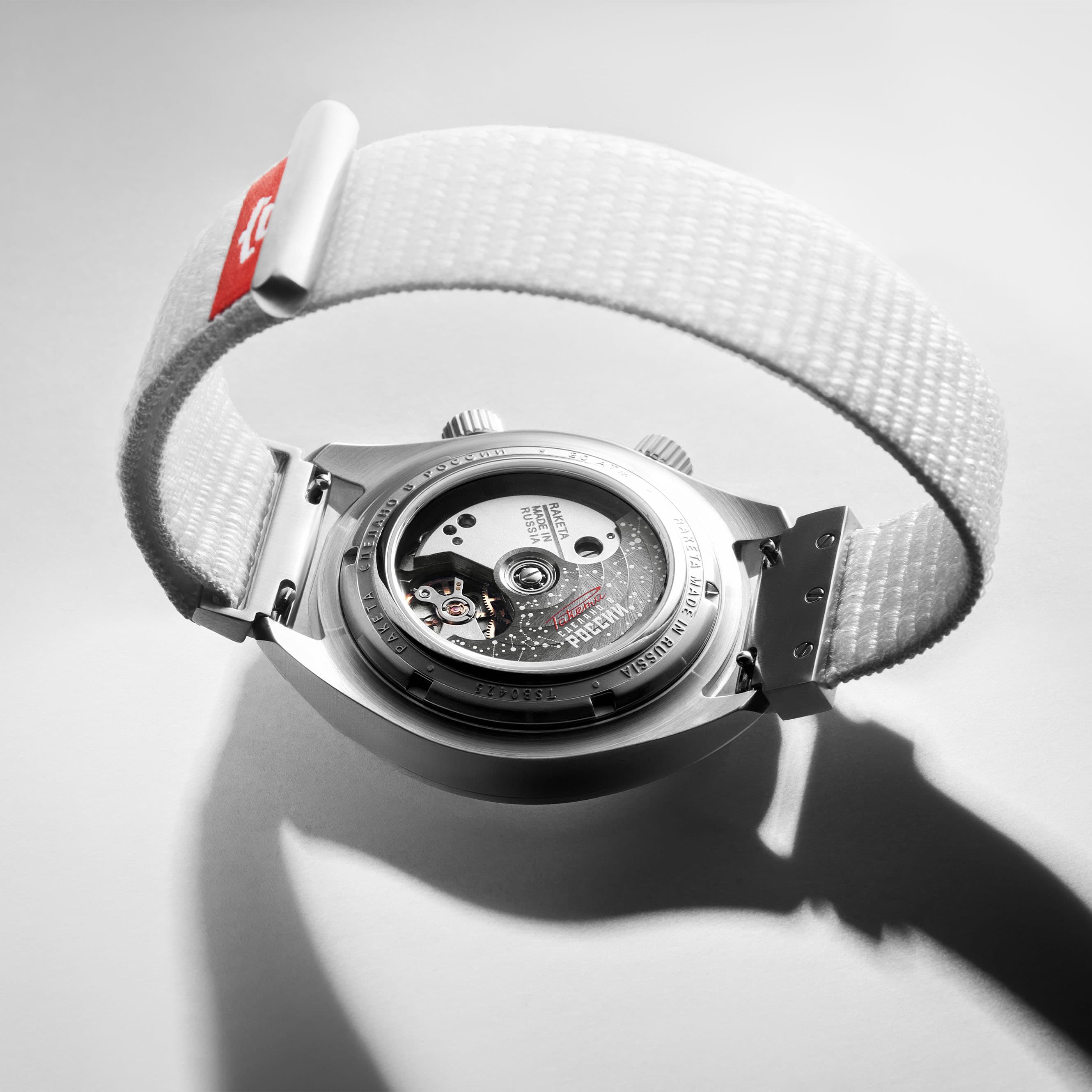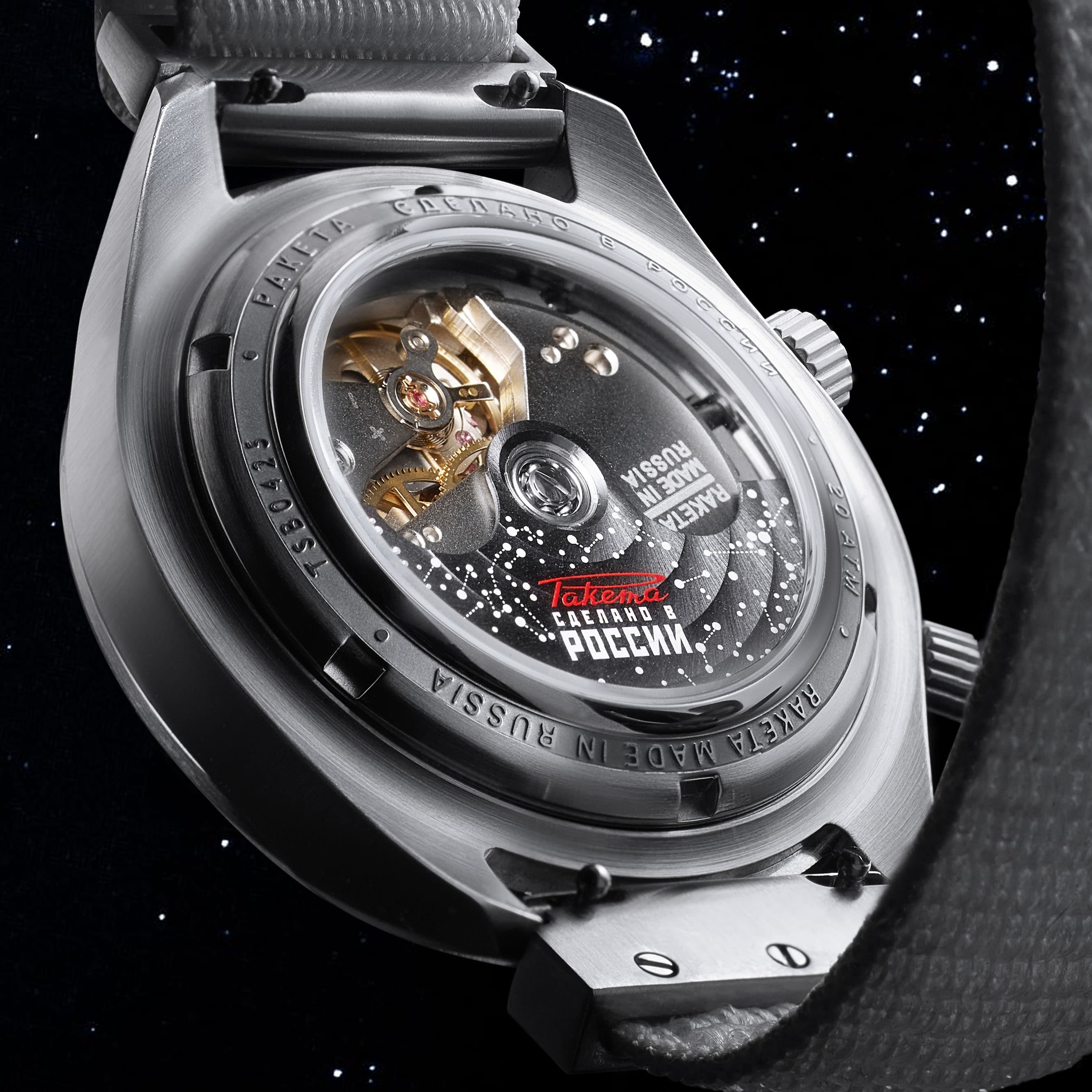 The open case back cover reveals the movement and the rotor decorated with an image of constellations. In zero gravity, the conditions are not ideal for a self-winding movements, so it's better for cosmonauts to wind their watches manually. However, manual winding over a long period of time causes wear on the self-winding module. To avoid this, Raketa movements have a unique function that disconnects the self-winding module during manual winding to protect it from premature wear throughout the space travel.