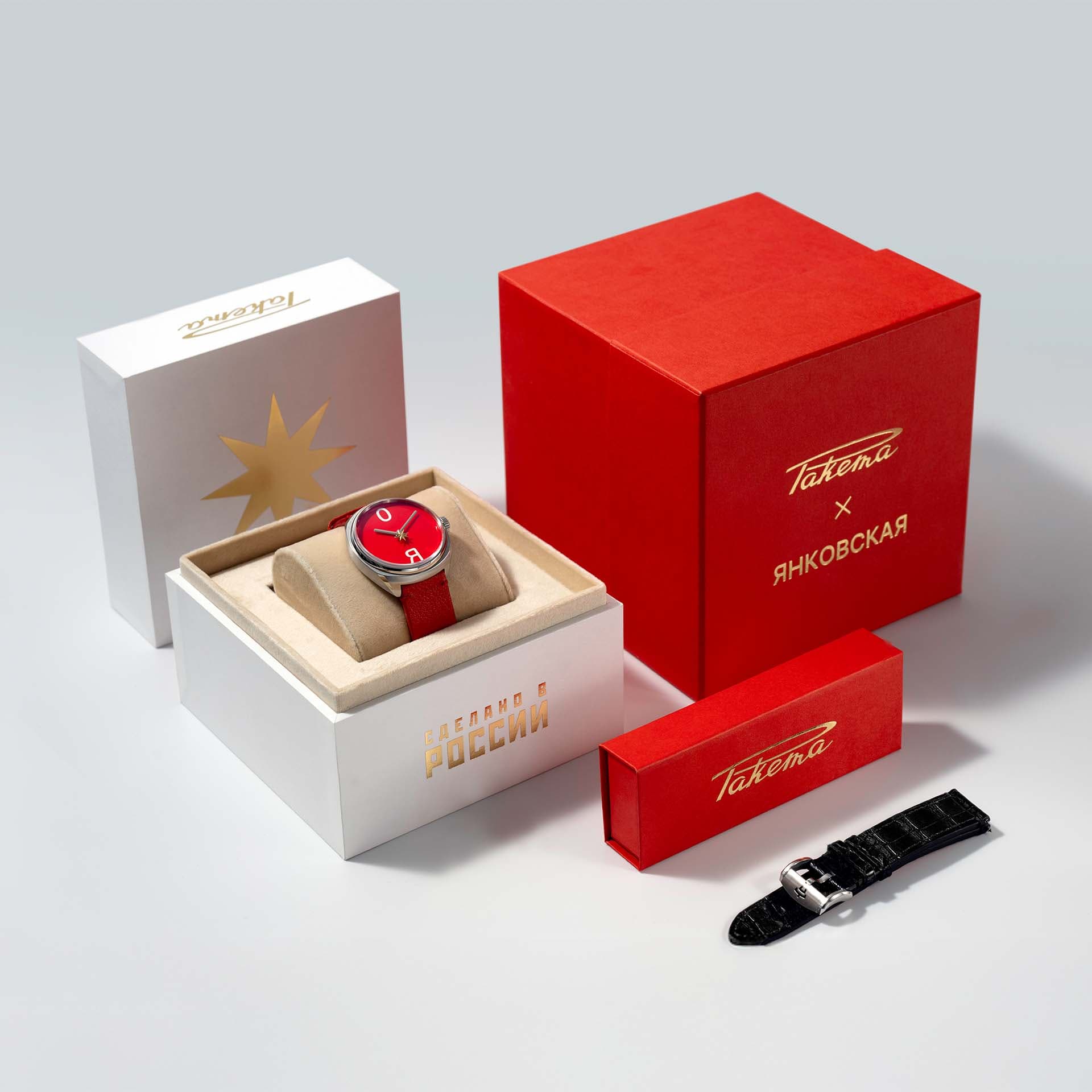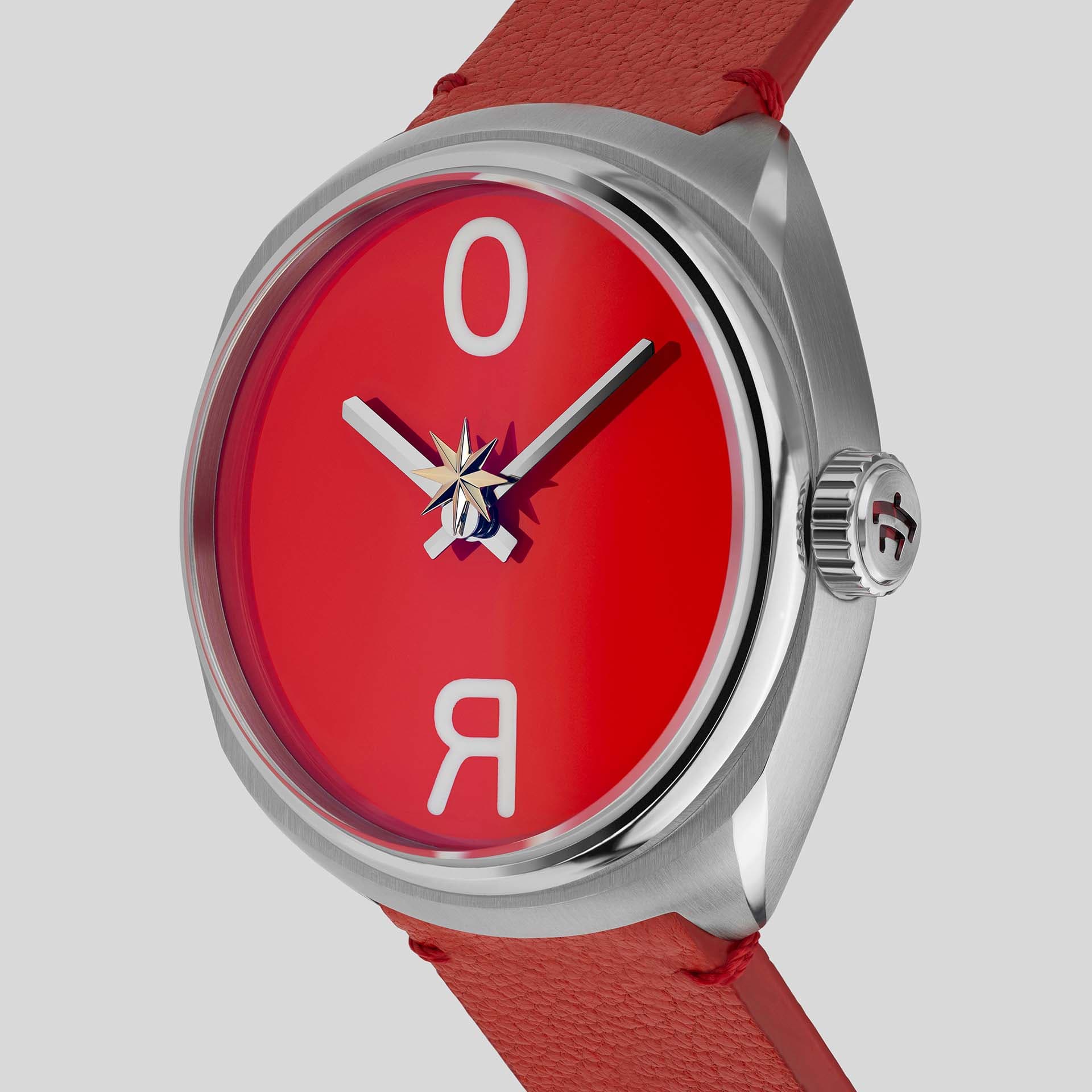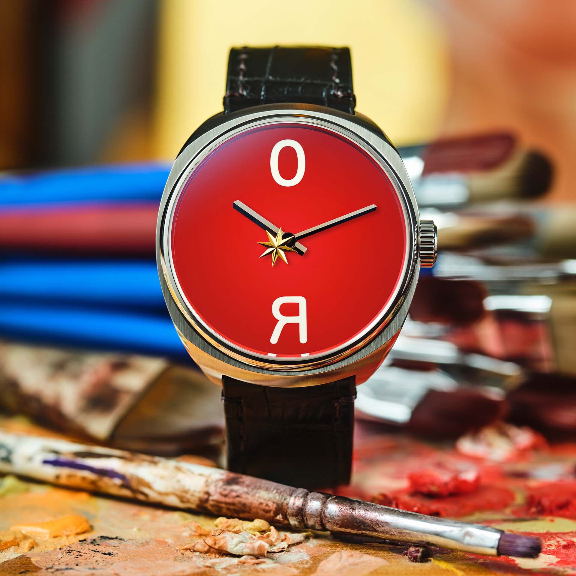 The watch design features Masha's signature red colour which is also symbolic for Raketa. The center of the dial features a rotating star drawn from the artist’s vivid visual language. In Raketa’s watch, this concept translates into the seconds hand, combining a symbolic artistic dimension with the rhythm of time. A red genuine leather strap matches the overall colour scheme. The set also includes a classic black alligator leather strap.