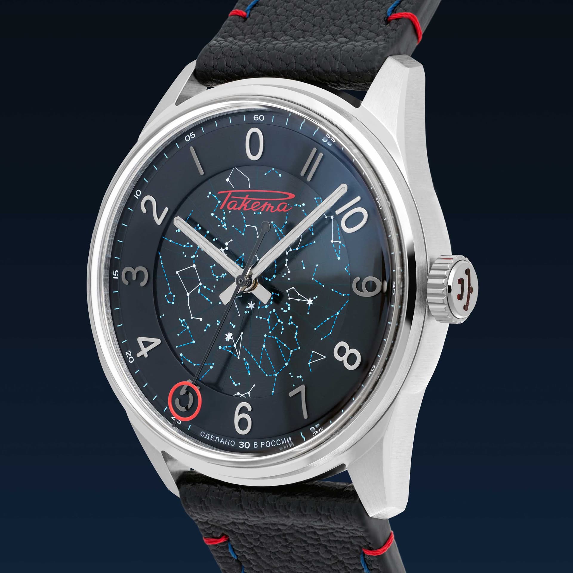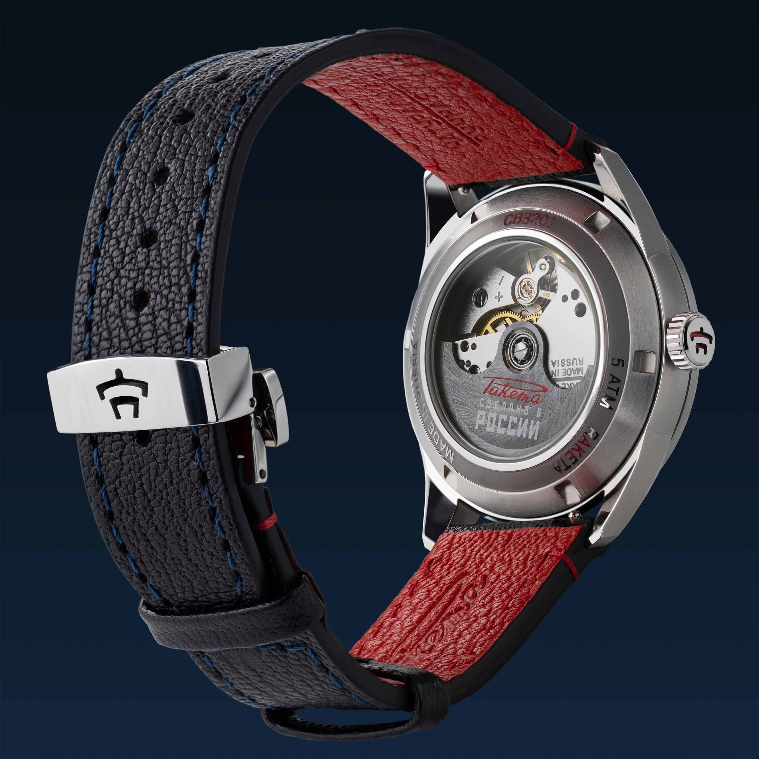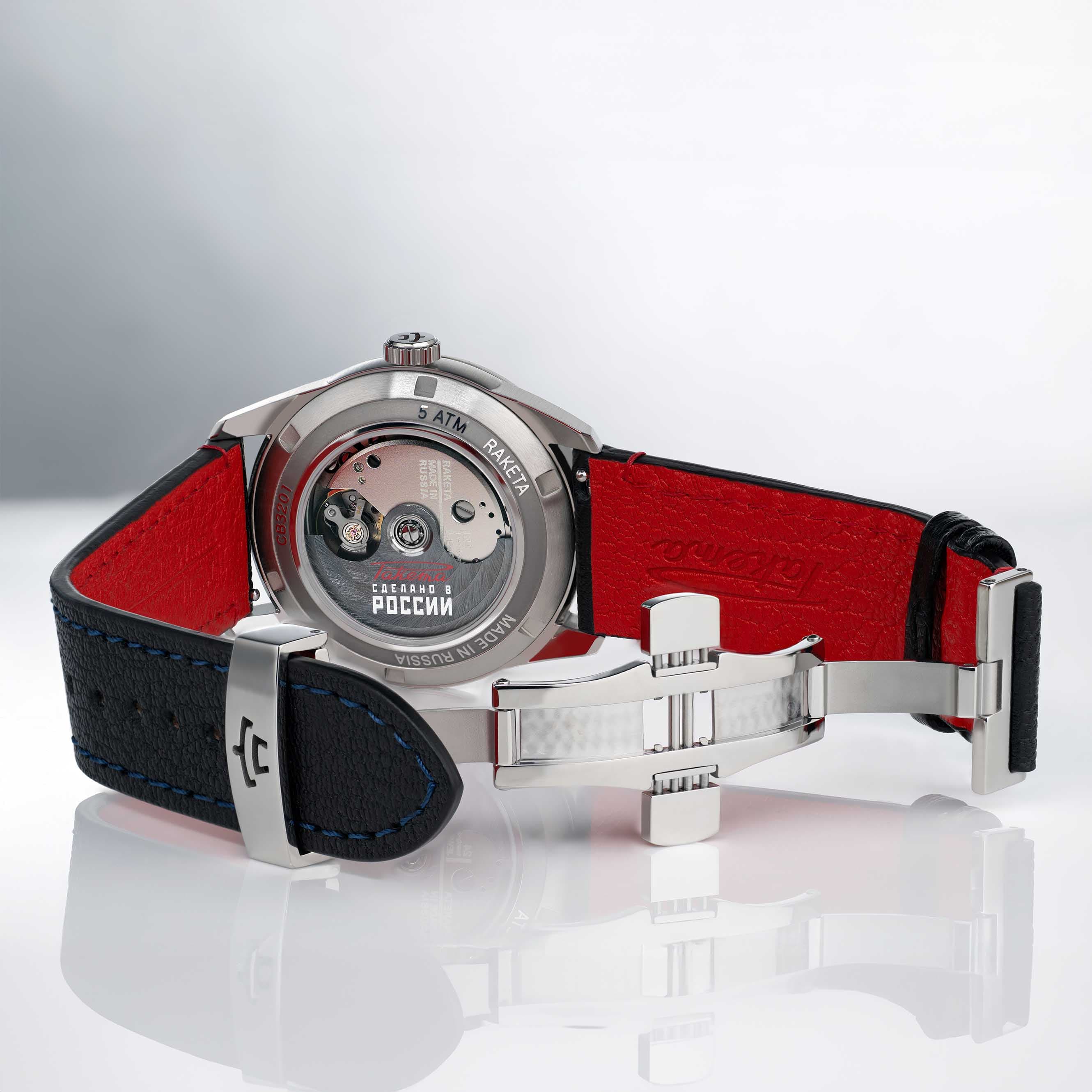 A multi-faceted case with rounded curves and a multi-layered dial with two types of coatings on the indexes convey an extra 3 dimensional aspect to this watch. You will see through the case back a beautifully decorated automatic movement entirely manufactured and assembled at the Raketa Watch Factory in Saint-Petersburg.