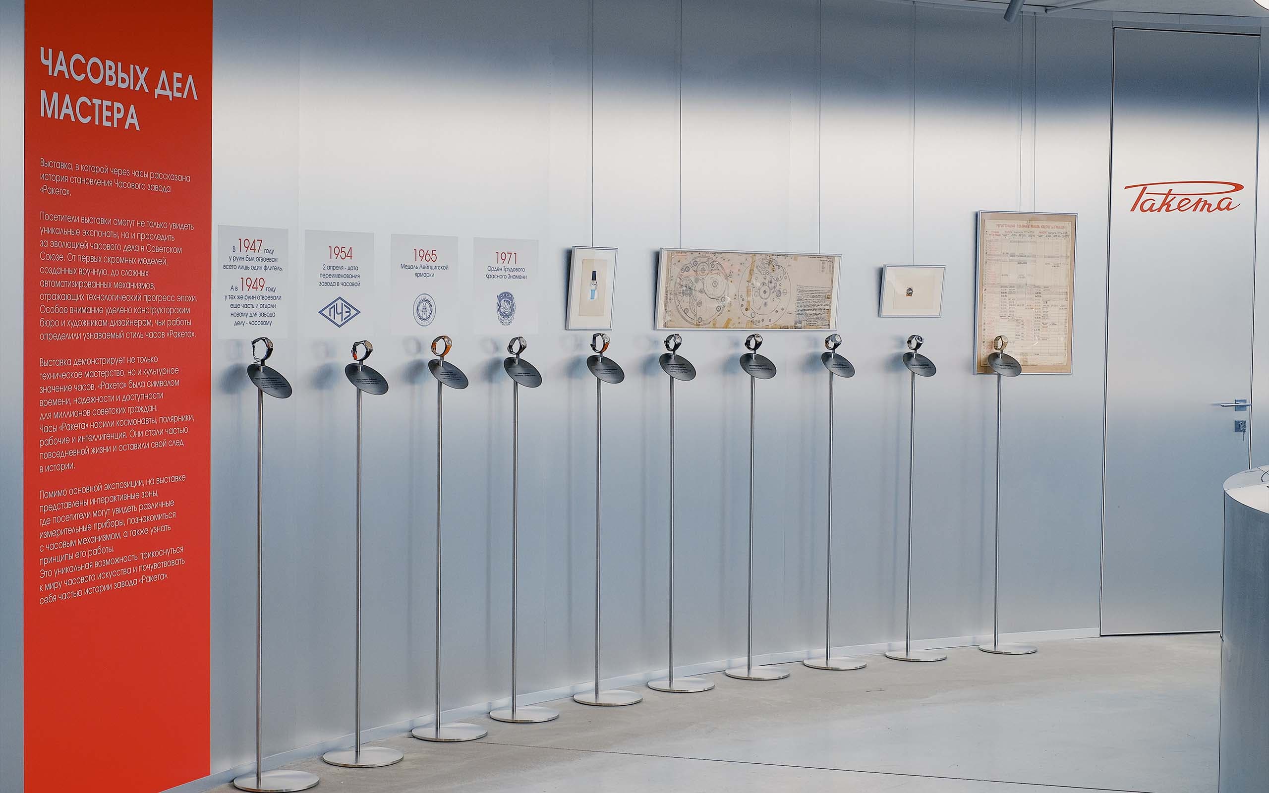 Посетители смогут увидеть уникальные экспонаты и проследить за эволюцией часового дела в СССР. Особое внимание уделено конструкторским бюро и художникам-дизайнерам, чьи работы определили узнаваемый стиль часов «Ракета».